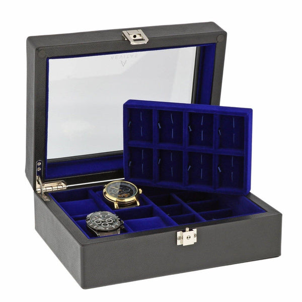 Superb Quality and Design, the luxury look of this Black Leather watch box is just perfect. It will hold neatly up to 16 Pair Cufflinks and 4 Piece Watch Box in Black Leather in the soft yet firm cushion in the position you set them. Glass View through lid with push button catch. Chrome fittings for the modern classic look. Complete with Quality Gift Box. Holds watches up to 50 mm Wide Box Size 24.6 x 19 x 9.2 cm, Lockable Box