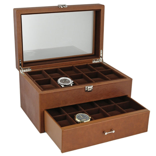 Superb Quality and Design, this luxury Cognac Brown Genuine Leather watch box is just perfect. It will hold neatly up to 20 wrist watches in the soft yet firm cushion in the position you set them. Glass View through lid with push button catch. Chrome fittings for the modern classic look.